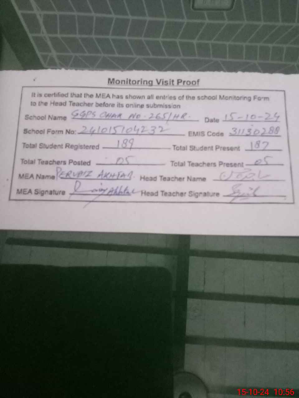 | Attendance Register | Head Teacher | MEA with School | Visit Proof |