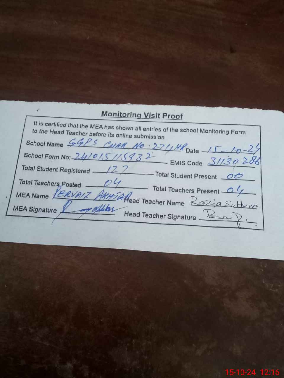 | EMIS Code: 31130286 | Name of School: GGPS CHAK NO 271 HR W | |||