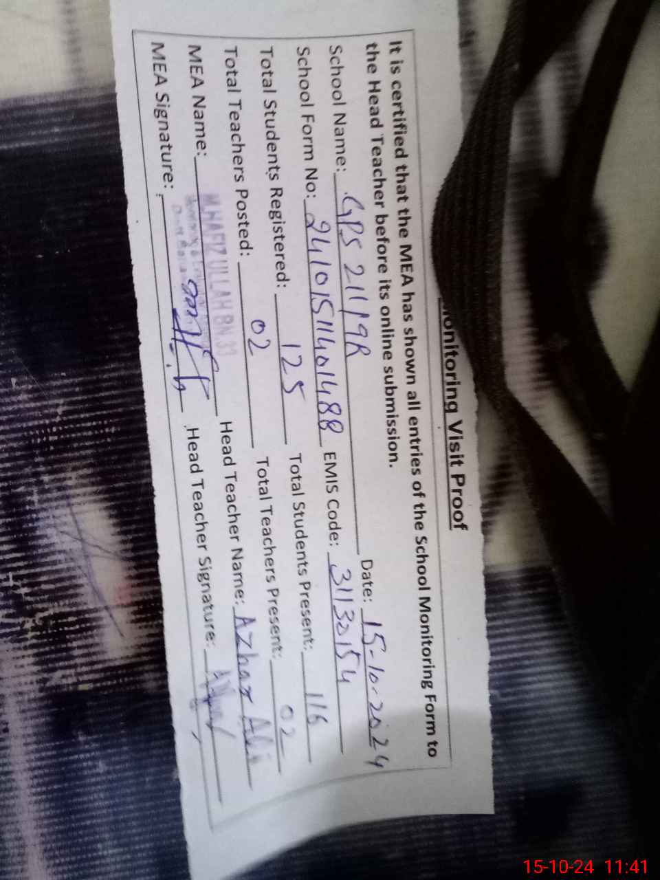 | Certified that this School was Inspected by the Undersigned MEA/DMO Today and the Information Stated Above is as Per Record. | |||||
