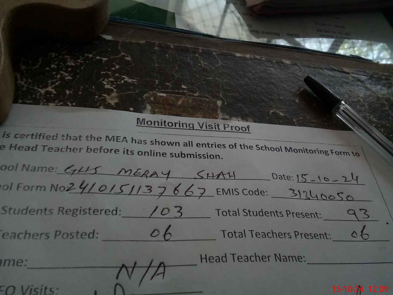 | Attendance Register | Head Teacher | MEA with School | Visit Proof |
