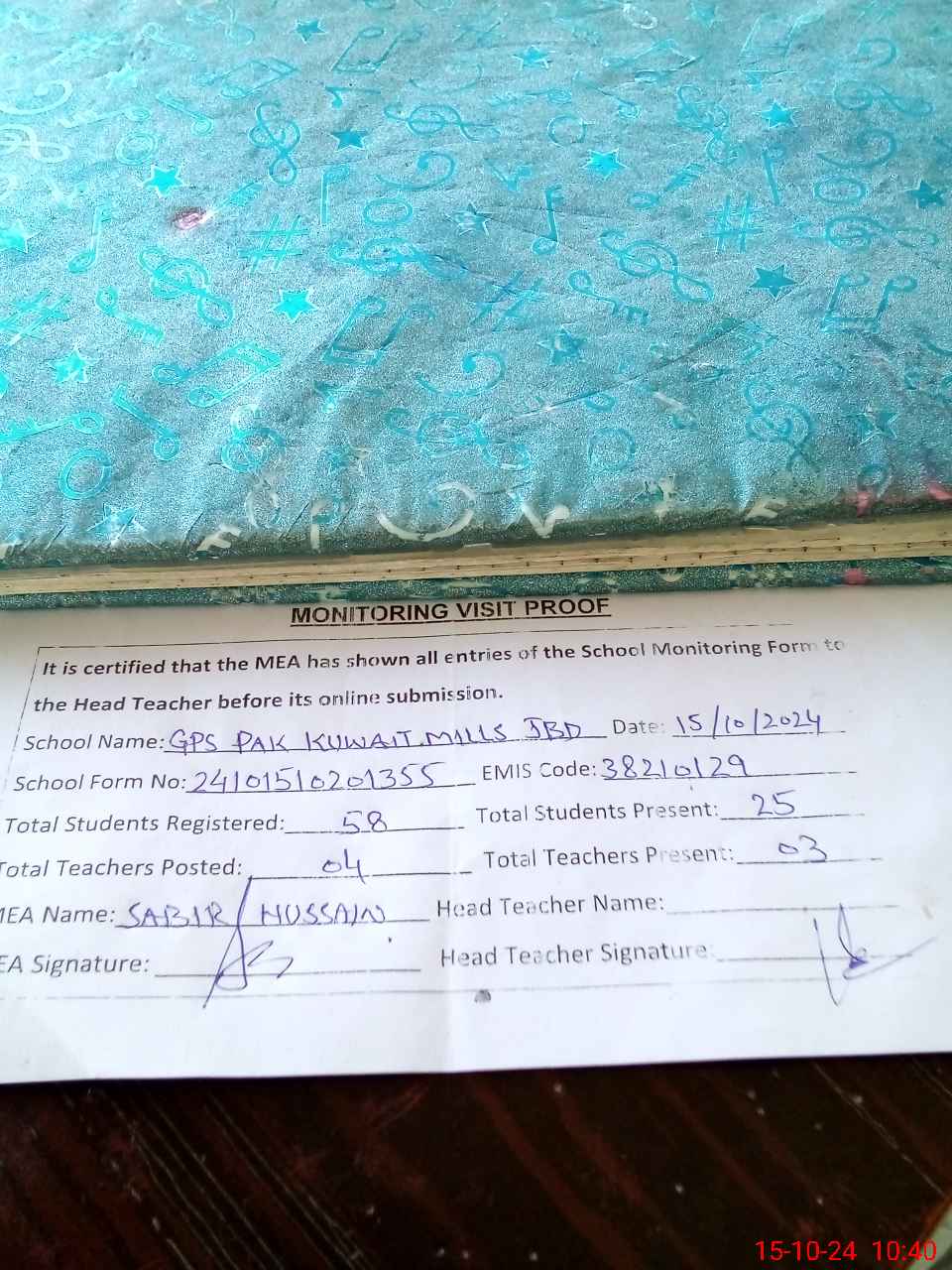 | Attendance Register | Head Teacher | MEA with School | Visit Proof |