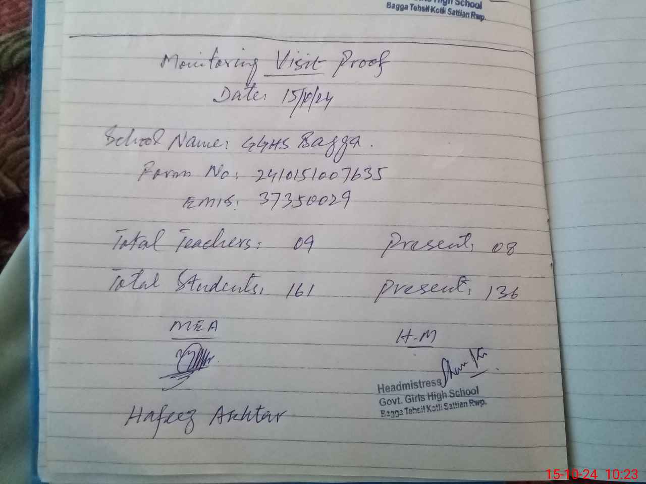 | Attendance Register | Head Teacher | MEA with School | Visit Proof |