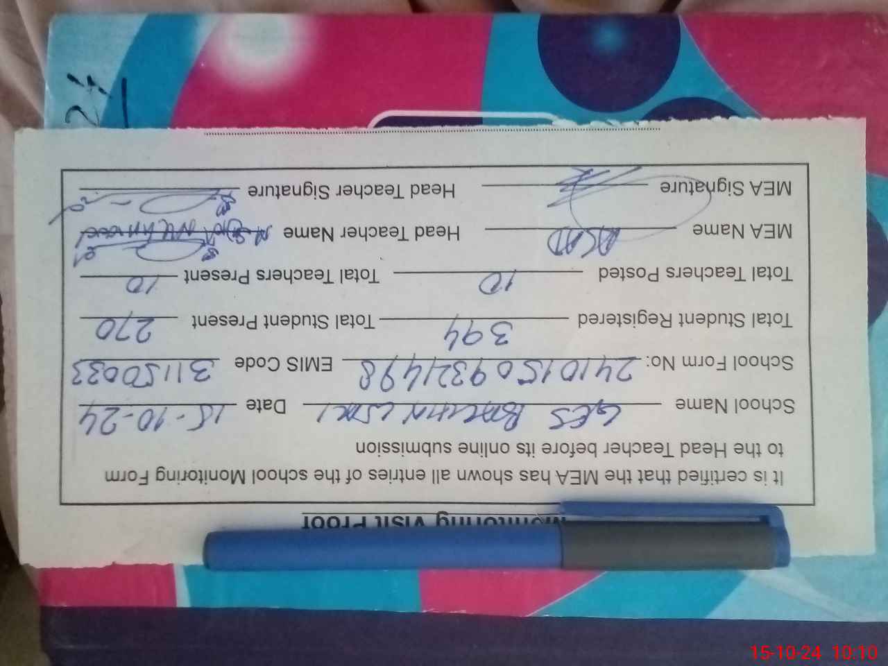 | Certified that this School was Inspected by the Undersigned MEA/DMO Today and the Information Stated Above is as Per Record. | |||||