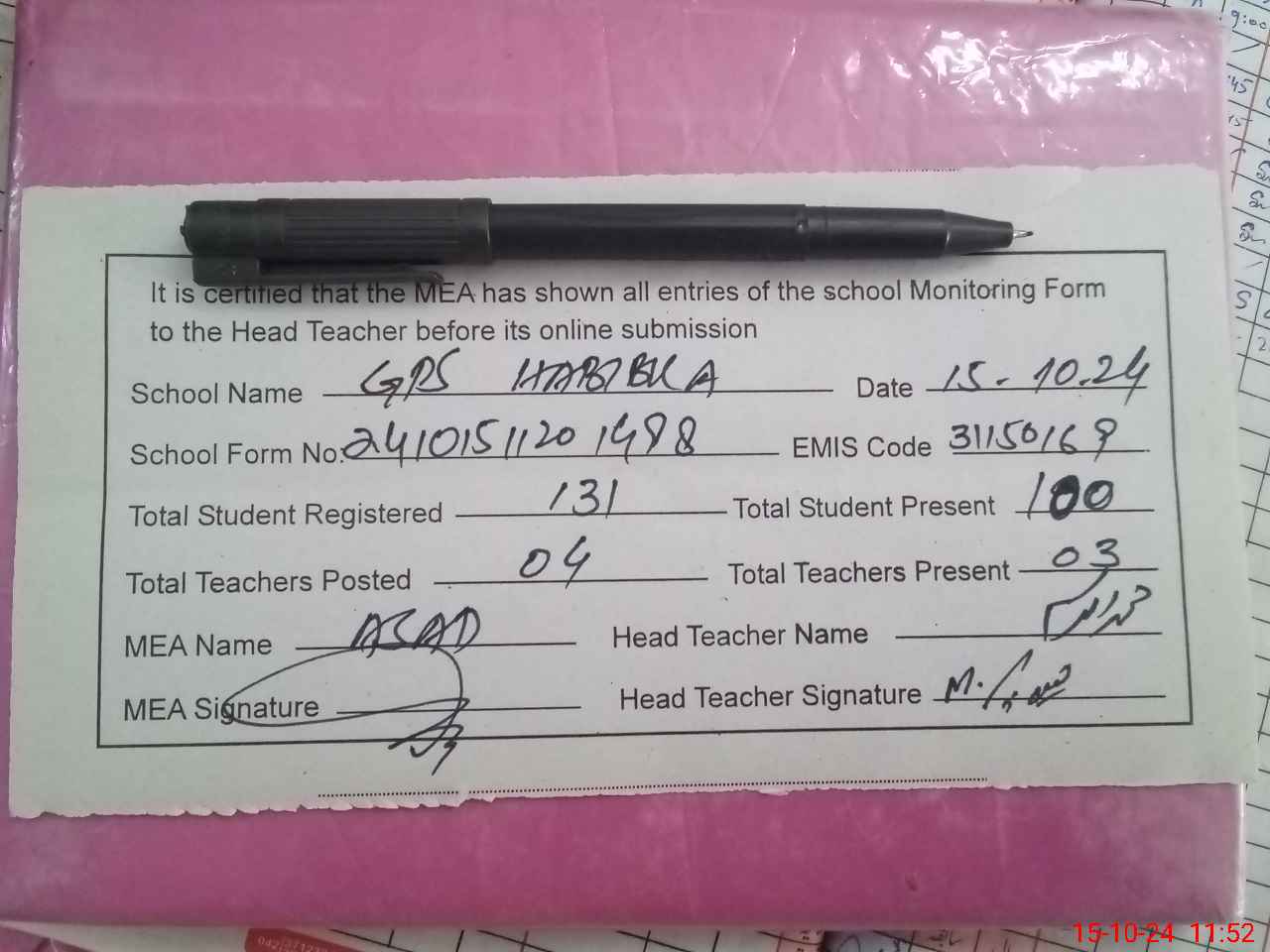| Certified that this School was Inspected by the Undersigned MEA/DMO Today and the Information Stated Above is as Per Record. | |||||