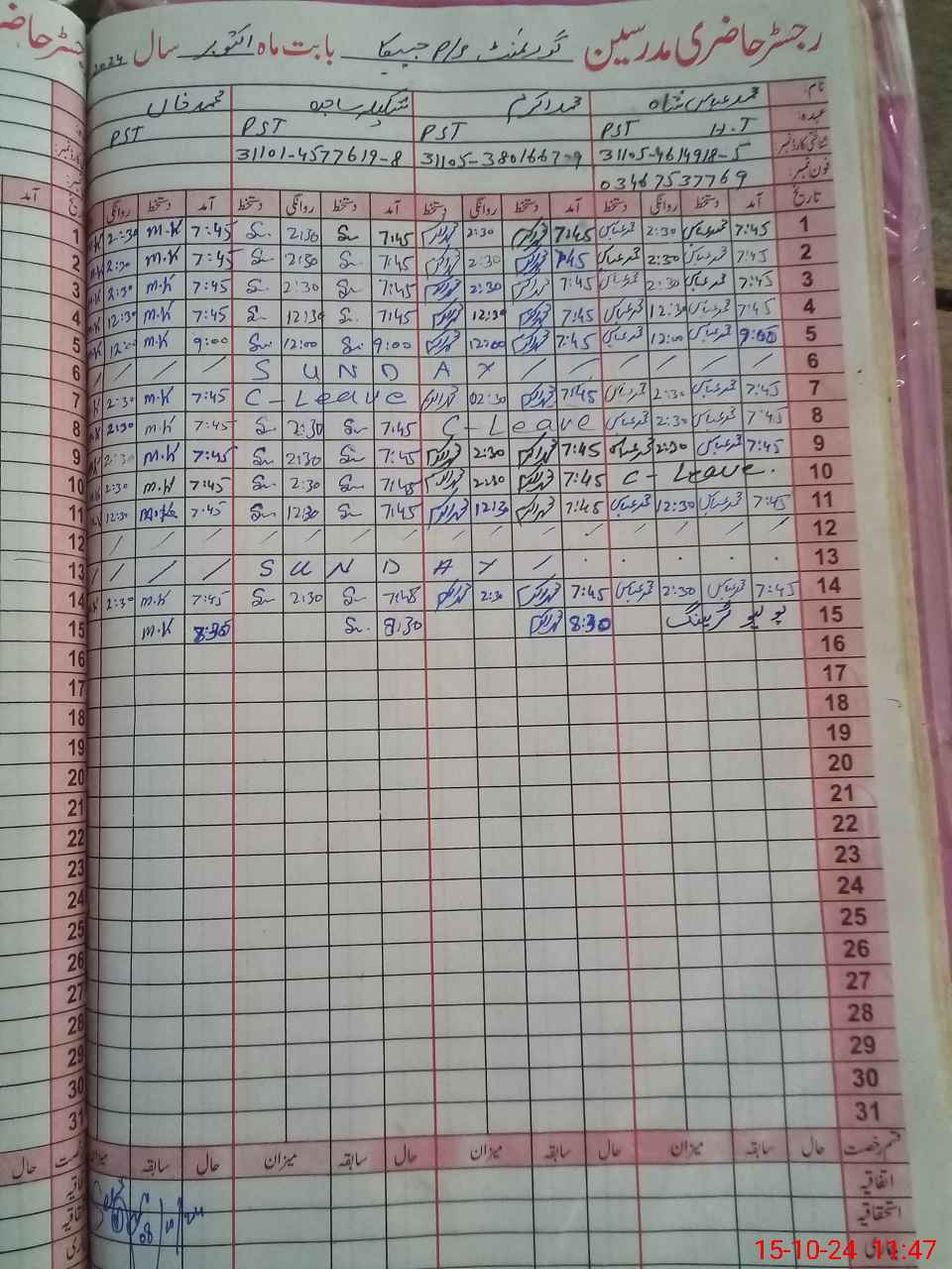 | CNIC | Full Name | Designation | R/C | Absence During Last Calender Month |