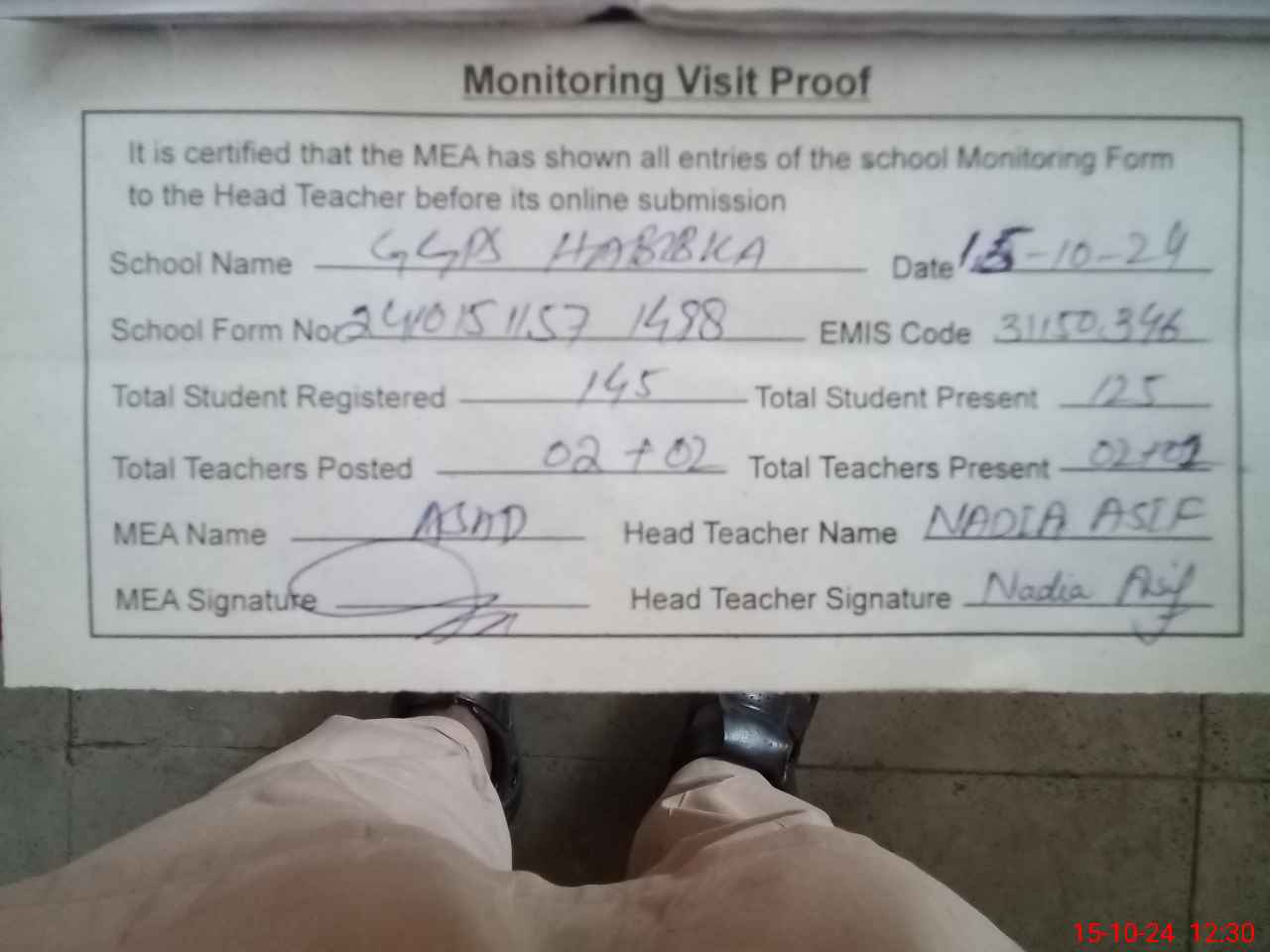 | Attendance Register | Head Teacher | MEA with School | Visit Proof |