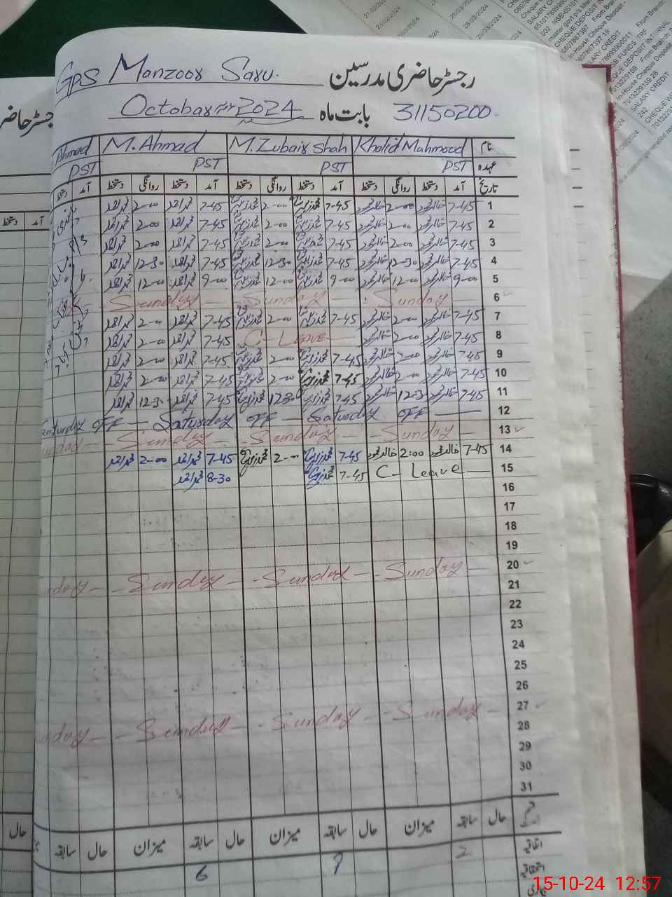 | CNIC | Full Name | Designation | R/C | Absence During Last Calender Month |