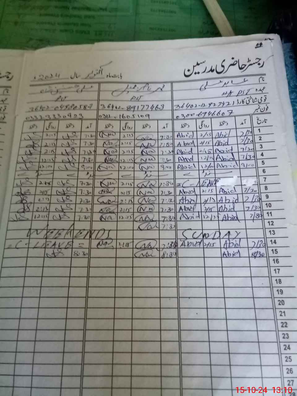 | CNIC | Full Name | Designation | R/C | Absence During Last Calender Month |