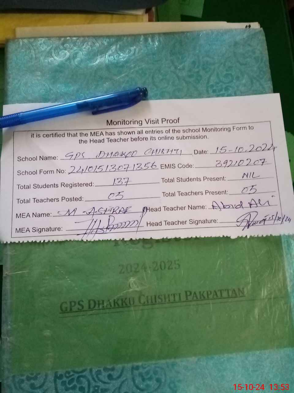 | Attendance Register | Head Teacher | MEA with School | Visit Proof |