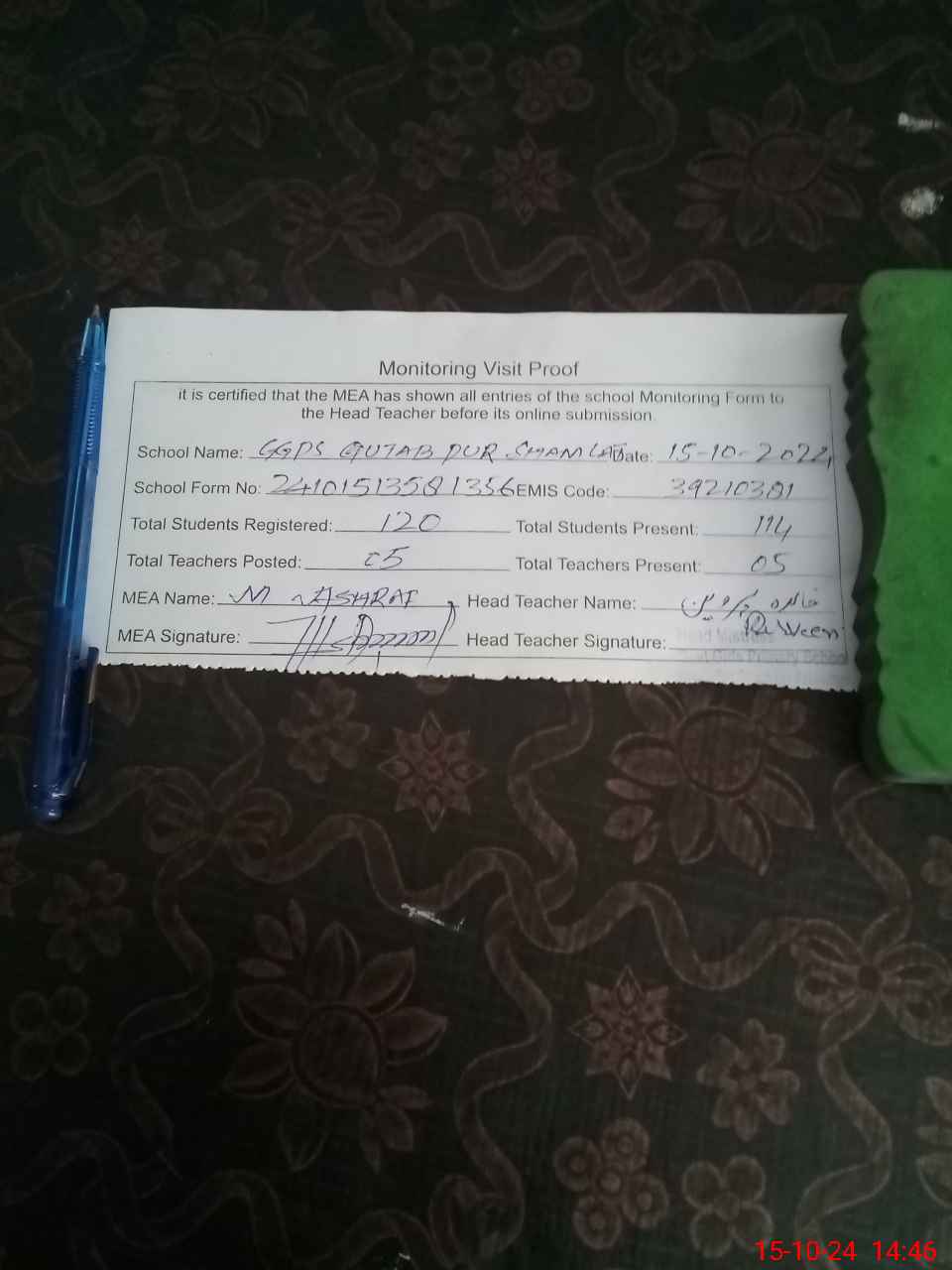 | EMIS Code: 39210381 | Name of School: GGPS QUTAB PUR SHAM LAT | |||