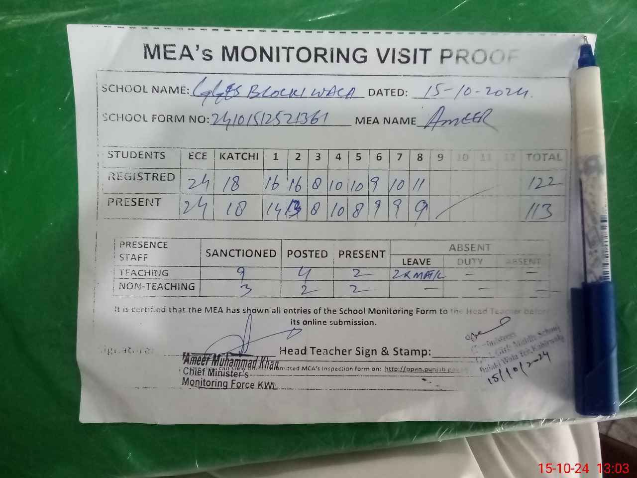 | Attendance Register | Head Teacher | MEA with School | Visit Proof |
