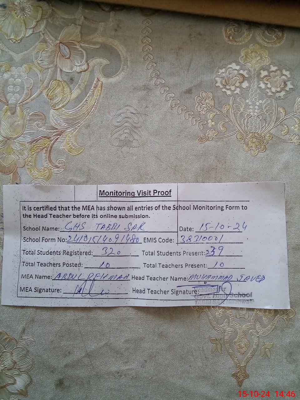 | Certified that this School was Inspected by the Undersigned MEA/DMO Today and the Information Stated Above is as Per Record. | |||||