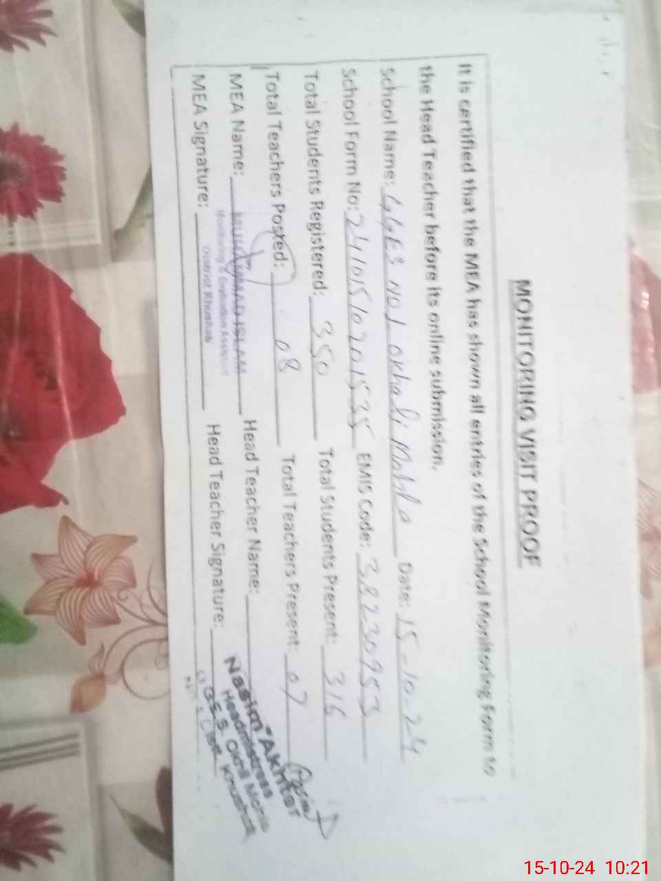| Certified that this School was Inspected by the Undersigned MEA/DMO Today and the Information Stated Above is as Per Record. | |||||