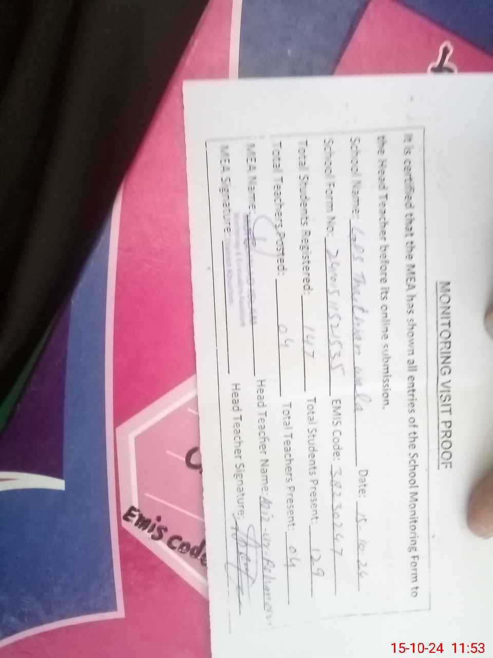 | Attendance Register | Head Teacher | MEA with School | Visit Proof |