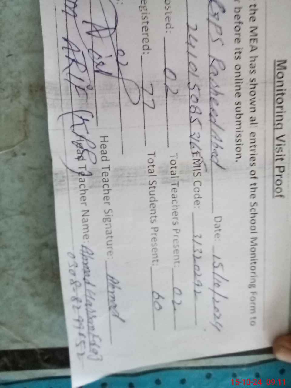 | Attendance Register | Head Teacher | MEA with School | Visit Proof |