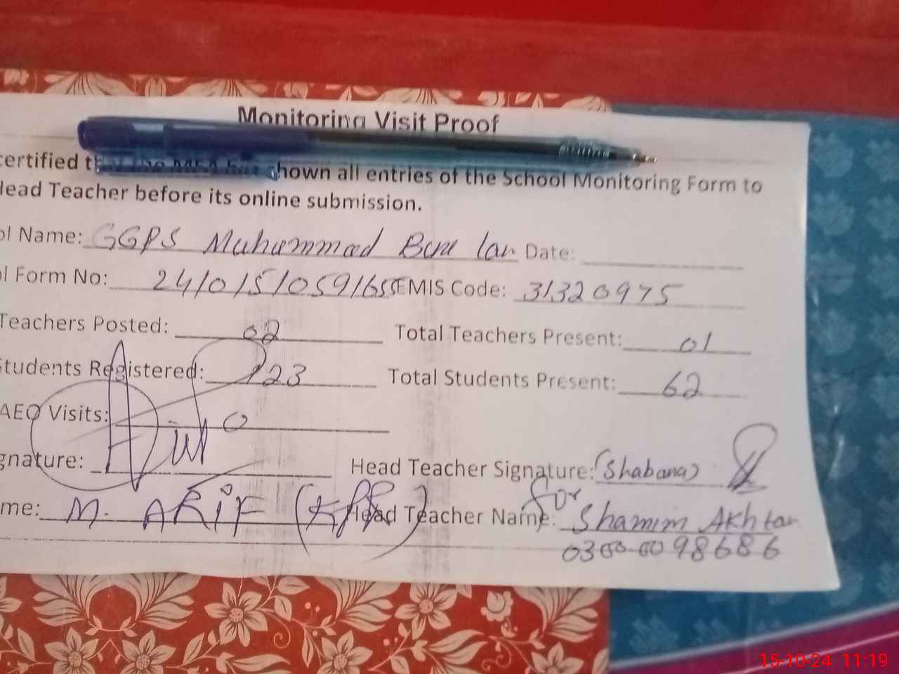 | Name: Sh**** Ak**** Designation: (School Headmaster's/Headmistress's) PST Phone/Cell Number: 03**** |