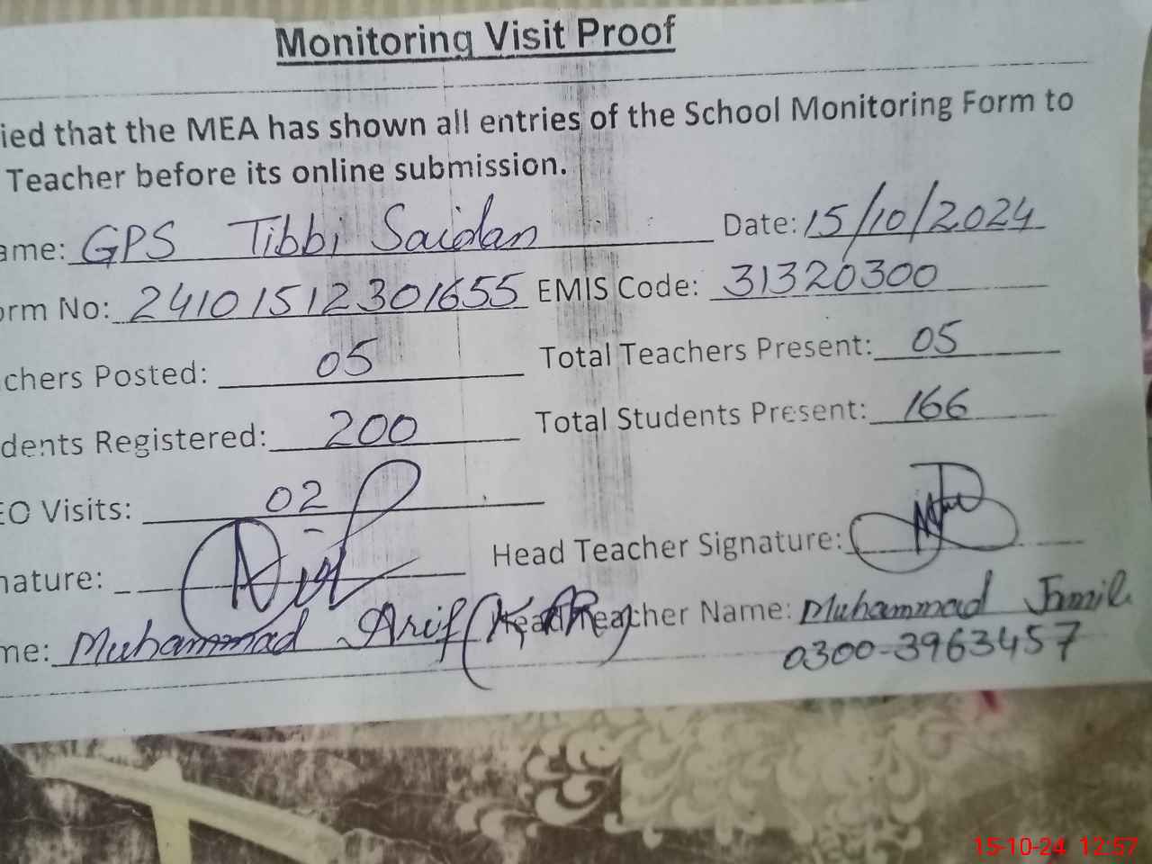 | Certified that this School was Inspected by the Undersigned MEA/DMO Today and the Information Stated Above is as Per Record. | |||||