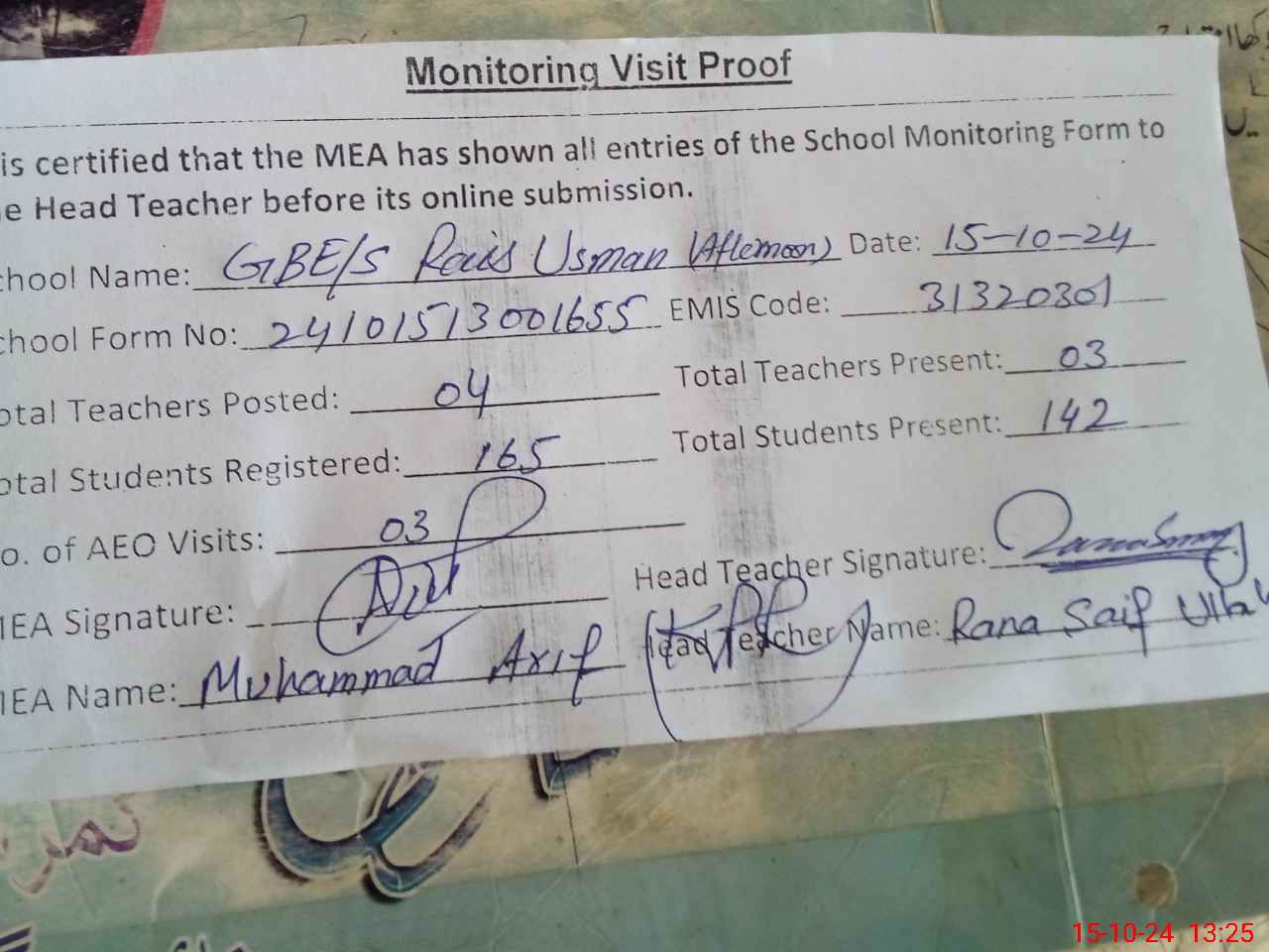 | Attendance Register | Head Teacher | MEA with School | Visit Proof |