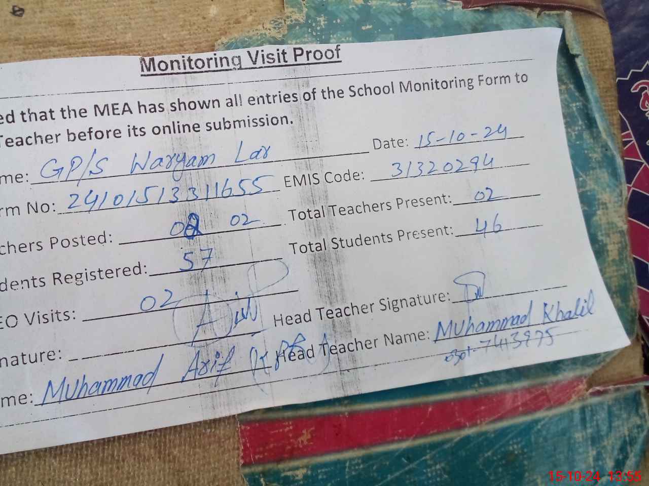 | Name: MU**** KH**** Designation: (School Headmaster's/Headmistress's) PST/PTC/JV Phone/Cell Number: 03**** |
