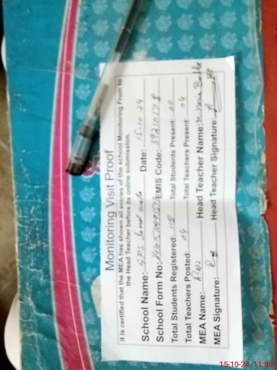 | Attendance Register | Head Teacher | MEA with School | Visit Proof |