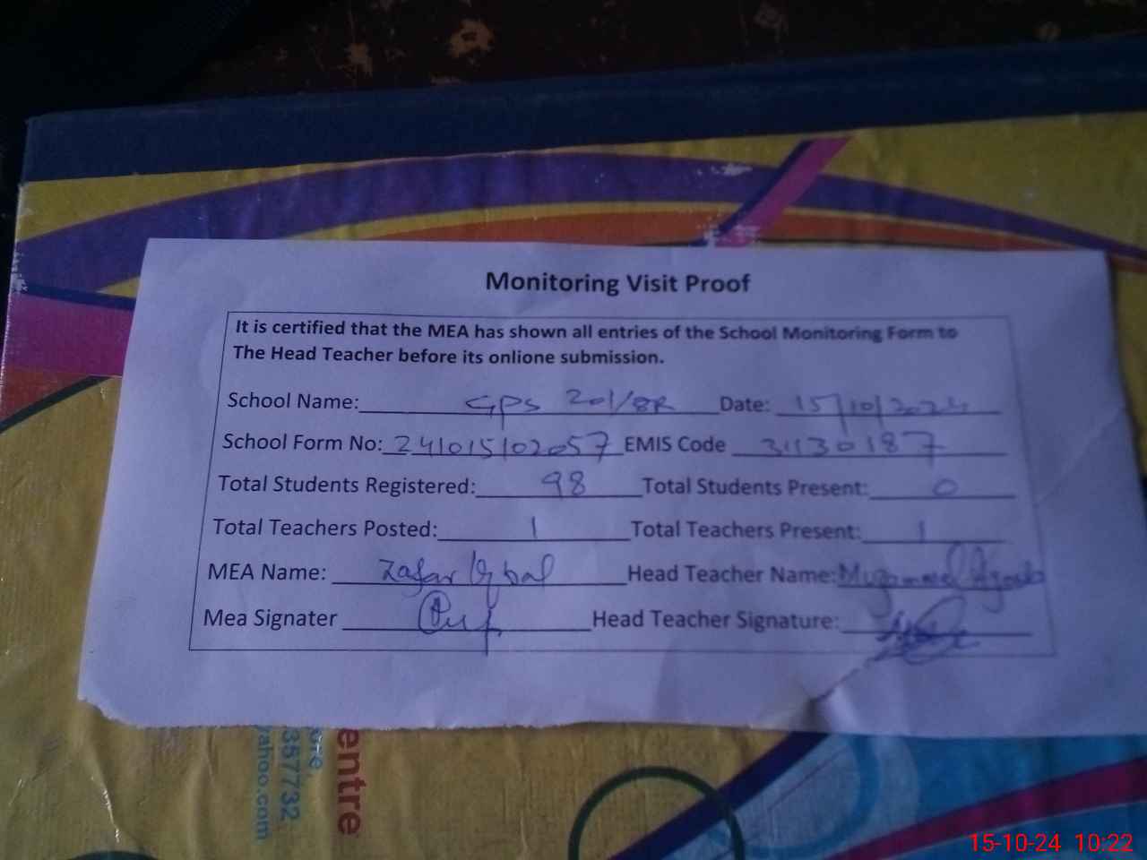 | Attendance Register | Head Teacher | MEA with School | Visit Proof |