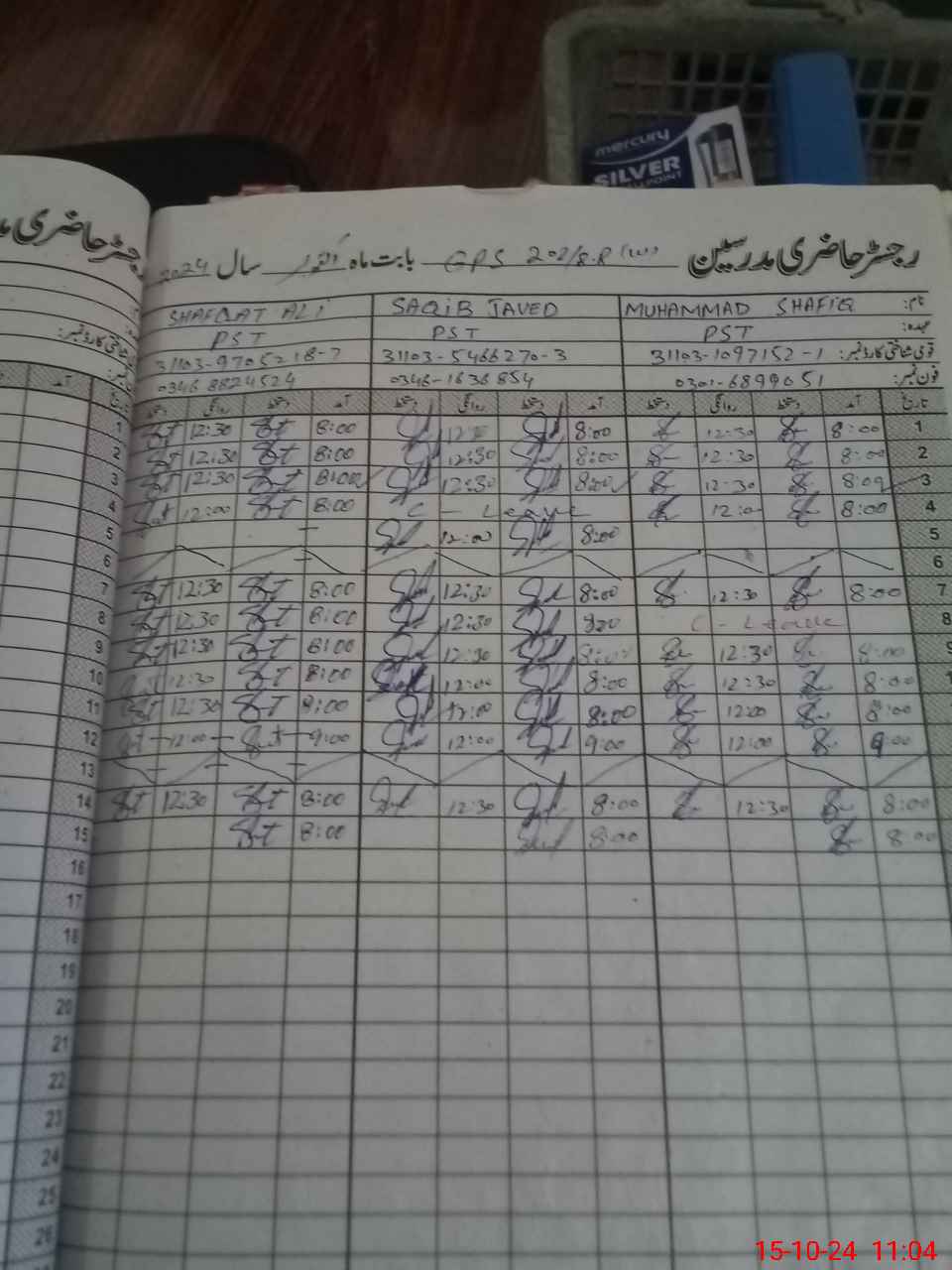 | CNIC | Full Name | Designation | R/C | Absence During Last Calender Month |