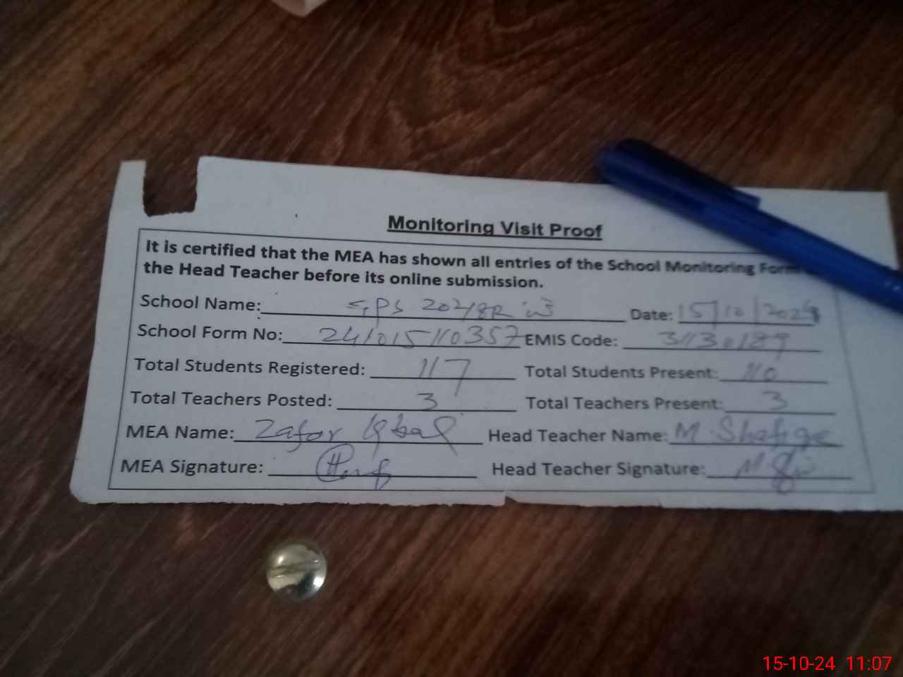 | Attendance Register | Head Teacher | MEA with School | Visit Proof |