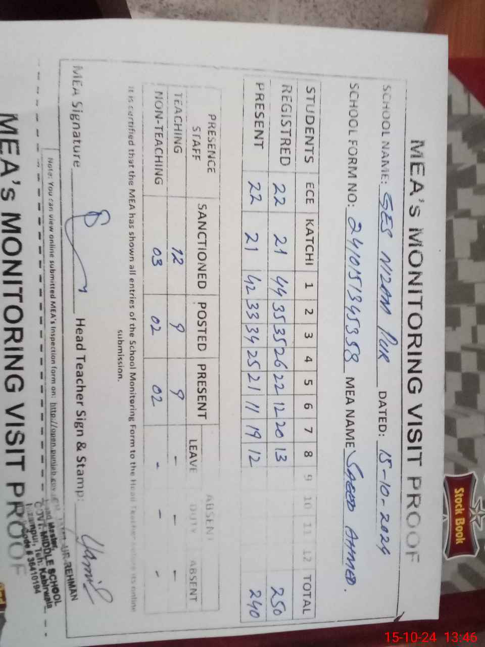 | Attendance Register | Head Teacher | MEA with School | Visit Proof |