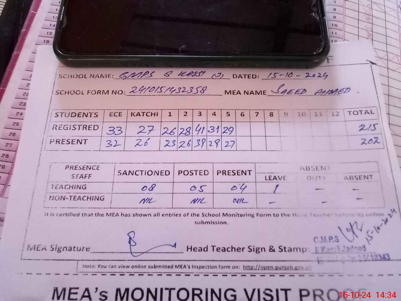 | Attendance Register | Head Teacher | MEA with School | Visit Proof |
