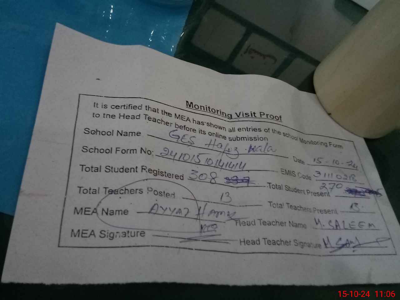 | Monitoring Date: 15-10-2024 | Start Time: 15-10-2024 10:14 AM | End Time: 15-10-2024 11:08 AM | Name of MEA: M.**** HA**** BN**** | |