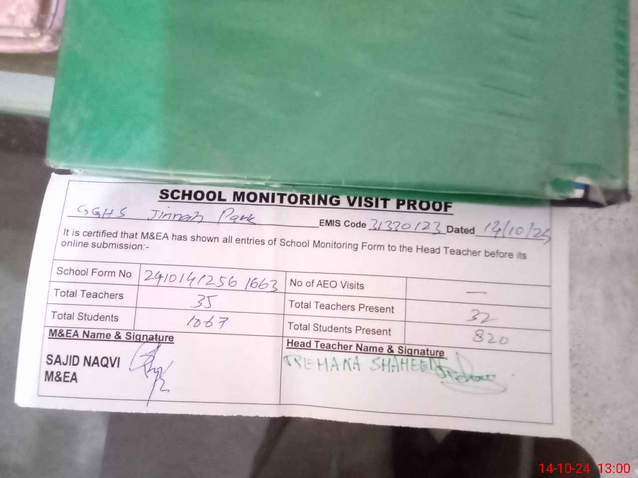 | Attendance Register | Head Teacher | MEA with School | Visit Proof |