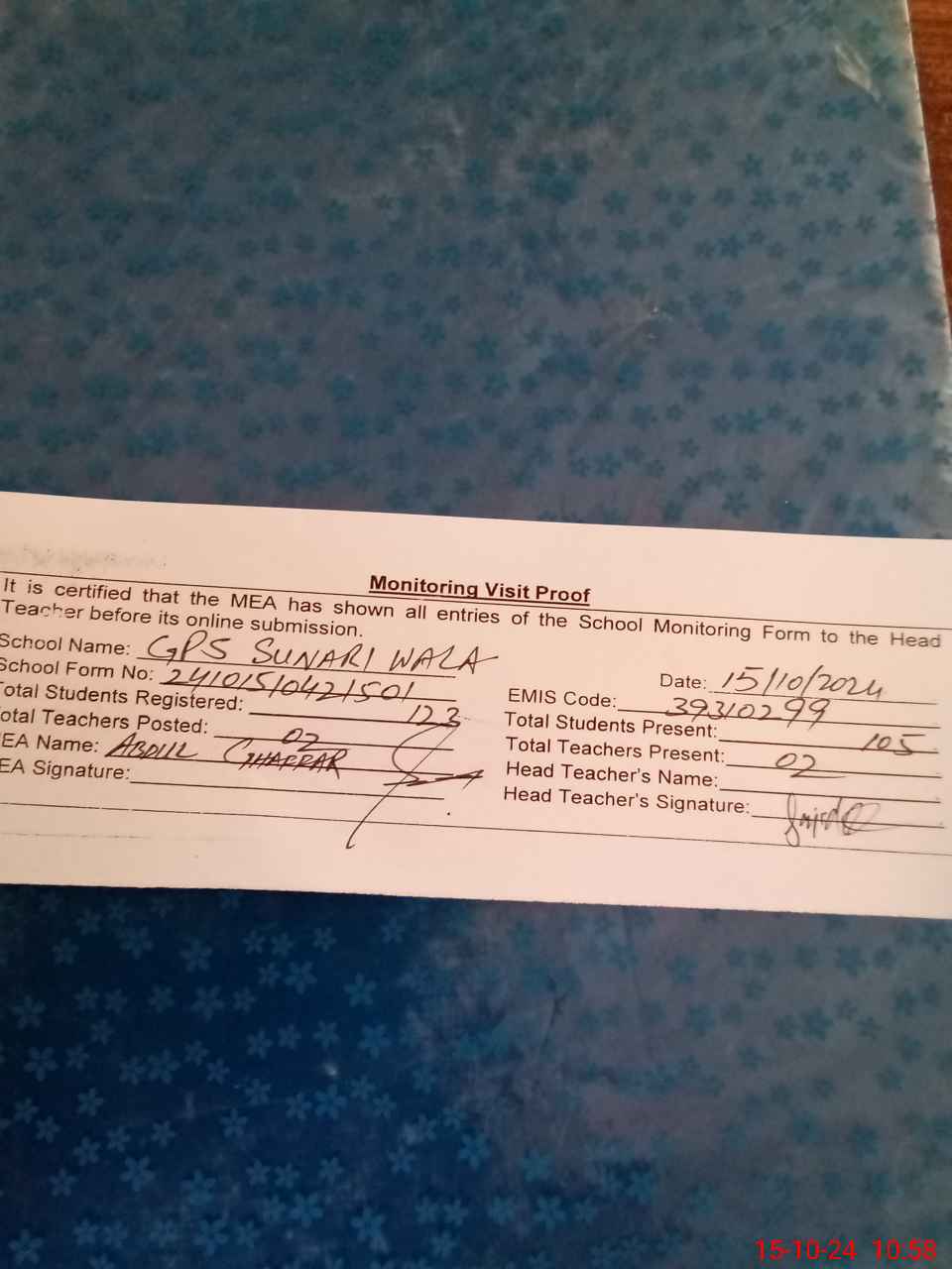 | EMIS Code: 39310299 | Name of School: GPS SUNARI WALA | |||
