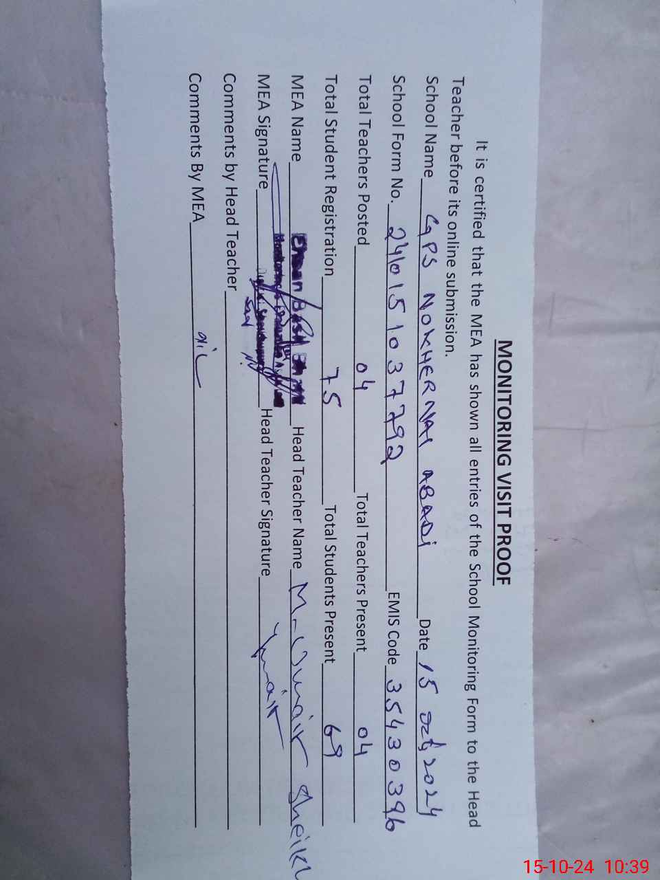 | Certified that this School was Inspected by the Undersigned MEA/DMO Today and the Information Stated Above is as Per Record. | |||||