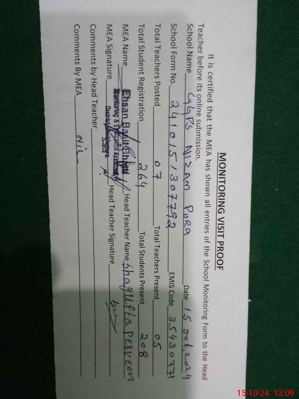 | Certified that this School was Inspected by the Undersigned MEA/DMO Today and the Information Stated Above is as Per Record. | |||||