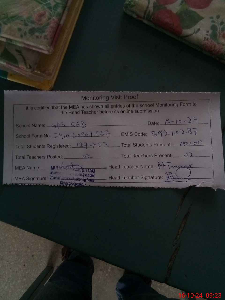 | Attendance Register | Head Teacher | MEA with School | Visit Proof |
