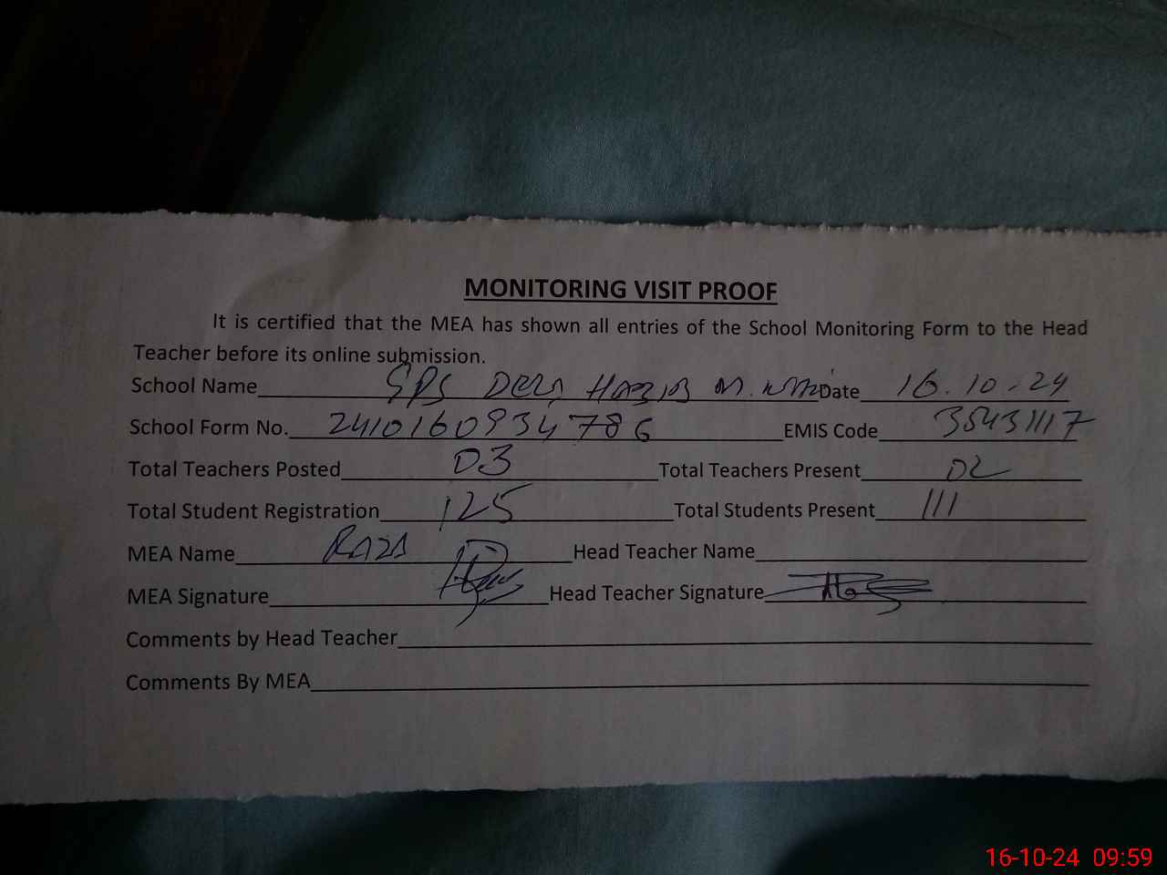 | Attendance Register | Head Teacher | MEA with School | Visit Proof |