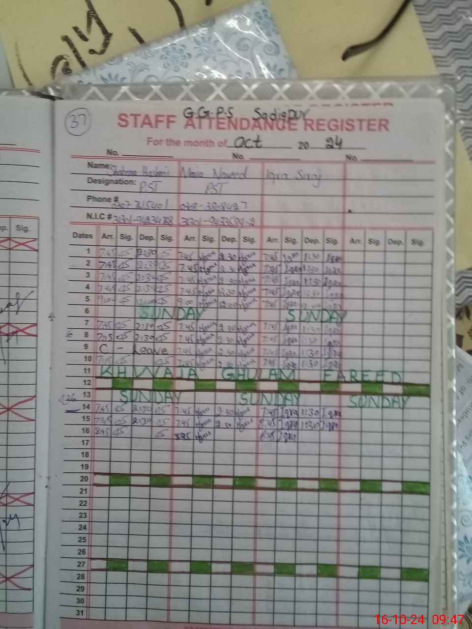 | CNIC | Full Name | Designation | R/C | Absence During Last Calender Month |