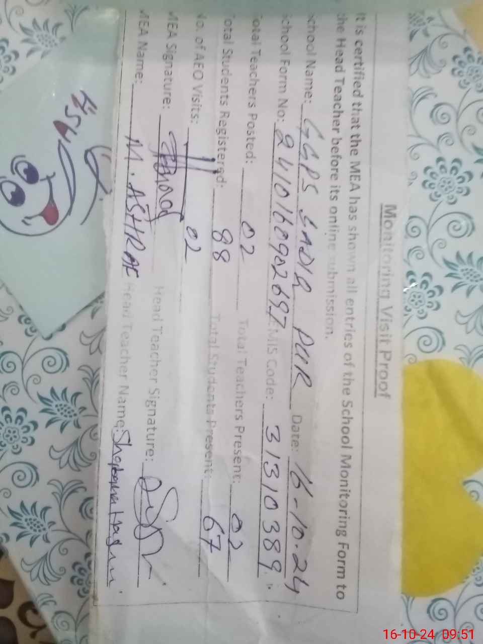 | Attendance Register | Head Teacher | MEA with School | Visit Proof |