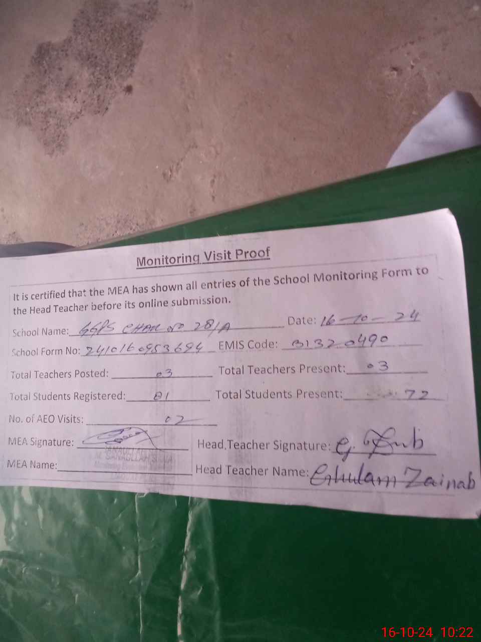 | Monitoring Date: 16-10-2024 | Start Time: 16-10-2024 09:53 AM | End Time: 16-10-2024 10:22 AM | Name of MEA: Mu**** Sa**** Ul**** Sa**** | |