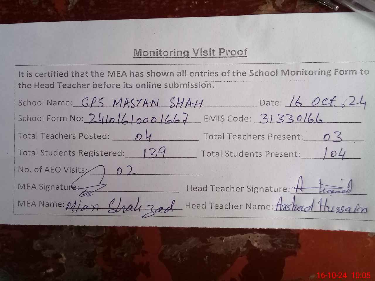 | Attendance Register | Head Teacher | MEA with School | Visit Proof |