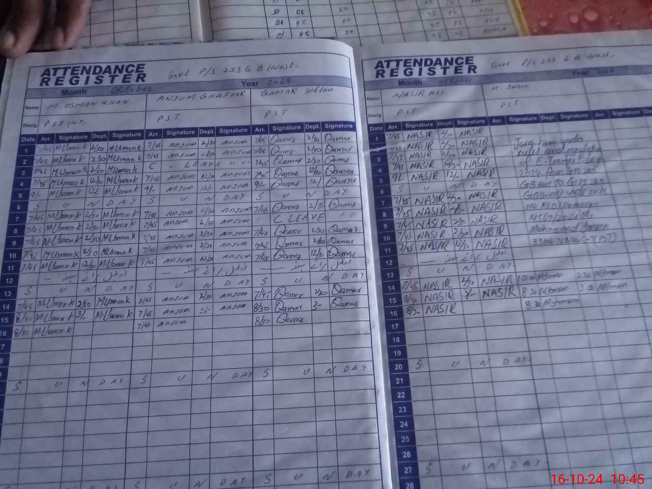 | CNIC | Full Name | Designation | R/C | Absence During Last Calender Month |