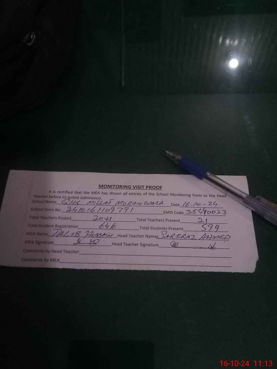| Attendance Register | Head Teacher | MEA with School | Visit Proof |