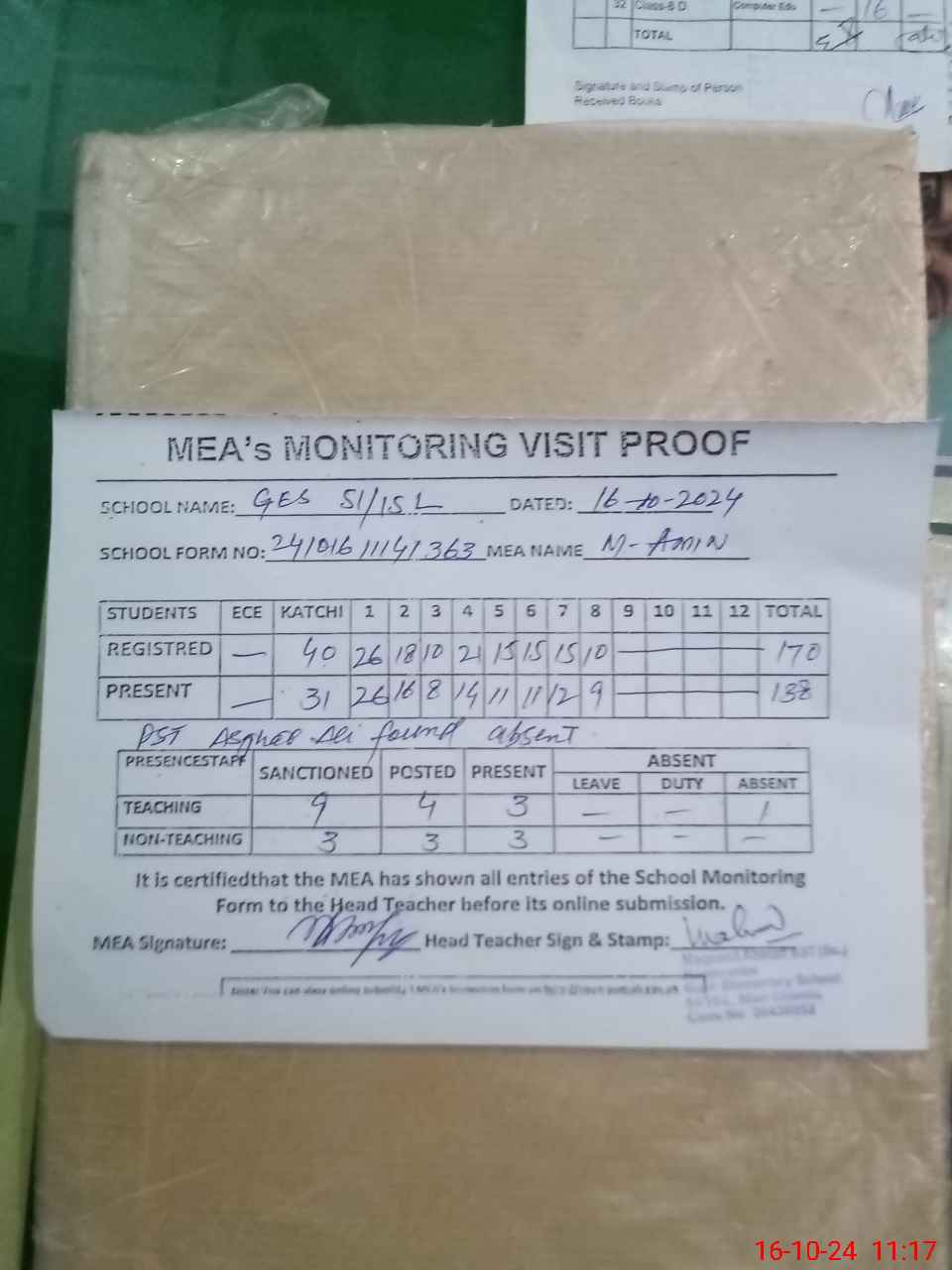 | Attendance Register | Head Teacher | MEA with School | Visit Proof |