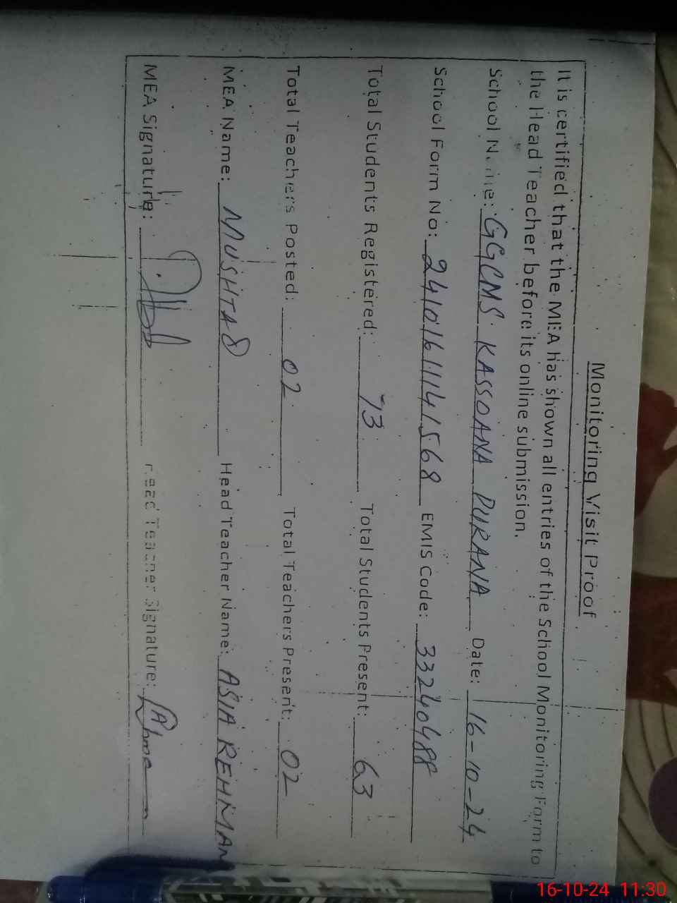 | Certified that this School was Inspected by the Undersigned MEA/DMO Today and the Information Stated Above is as Per Record. | |||||