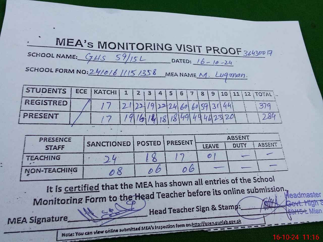 | Certified that this School was Inspected by the Undersigned MEA/DMO Today and the Information Stated Above is as Per Record. | |||||