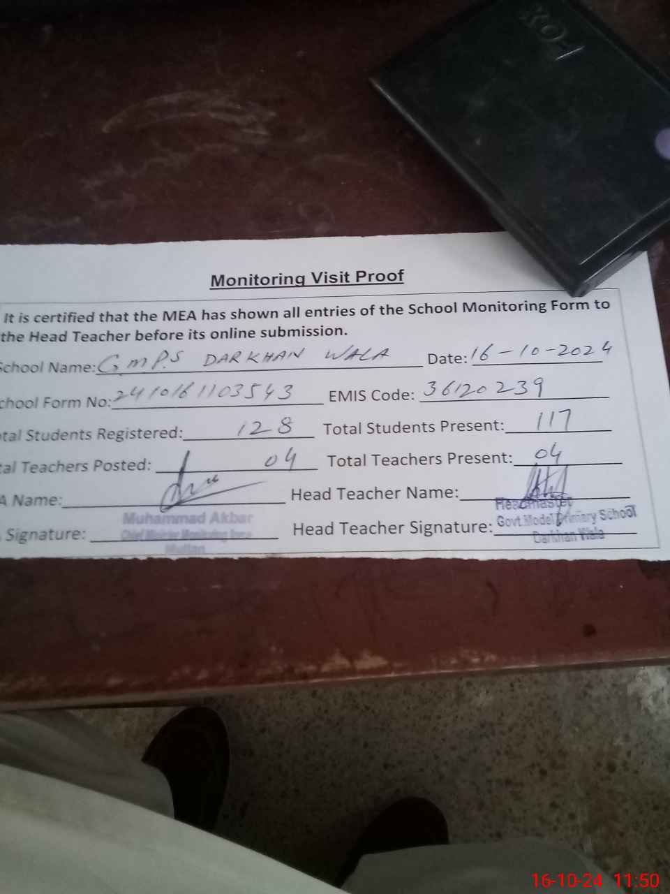 | Attendance Register | Head Teacher | MEA with School | Visit Proof |