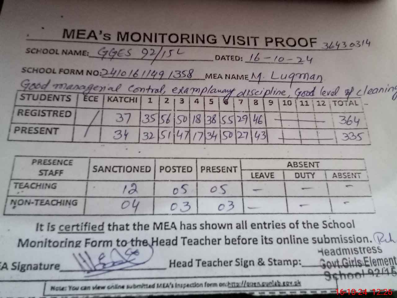 | Certified that this School was Inspected by the Undersigned MEA/DMO Today and the Information Stated Above is as Per Record. | |||||
