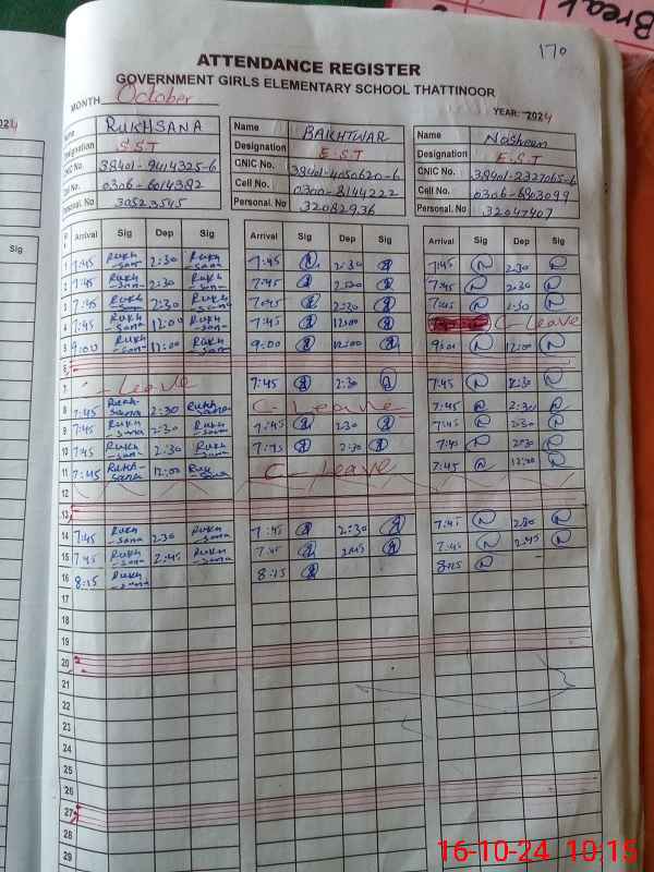 | CNIC | Full Name | Designation | R/C | Absence During Last Calender Month |