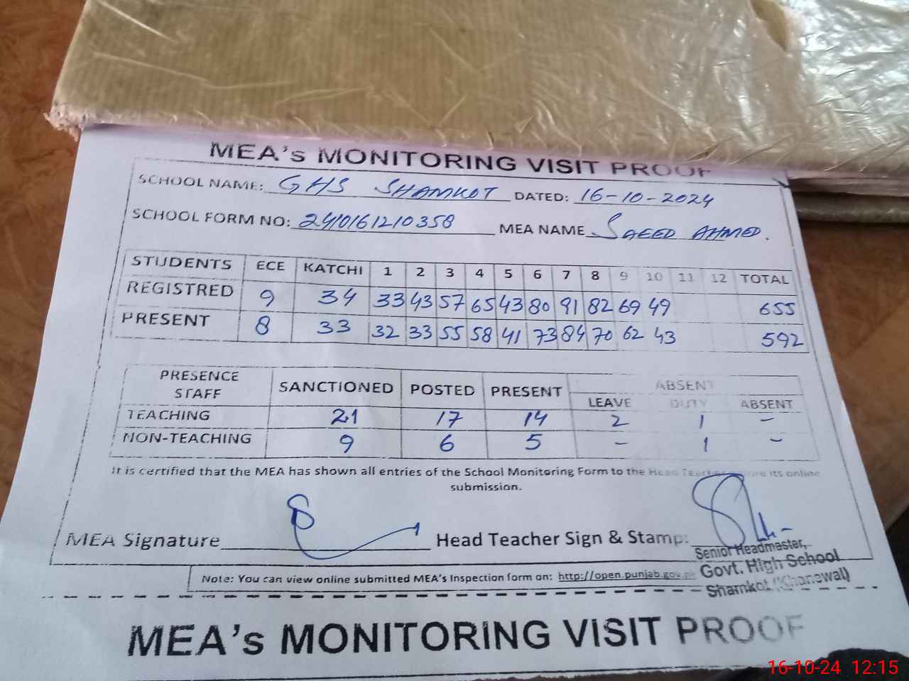 | Certified that this School was Inspected by the Undersigned MEA/DMO Today and the Information Stated Above is as Per Record. | |||||