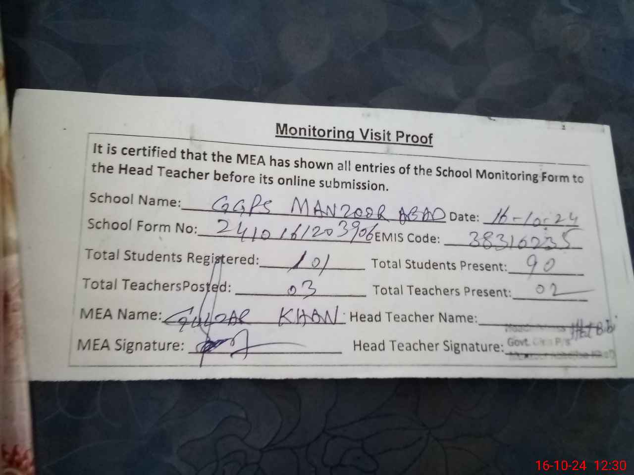 | Certified that this School was Inspected by the Undersigned MEA/DMO Today and the Information Stated Above is as Per Record. | |||||